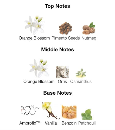 يتميز العطر بنفحات عليا من الفلفل الوردي وجوزة الطيب، تليها زهرة البرتقال الدافئة في القلب، وتستقر القاعدة على مزيج أنيق من الباتشولي، الفانيليا وAmbrofix™، لتمنحك عبيرًا فاخرًا يدوم طويلاً.